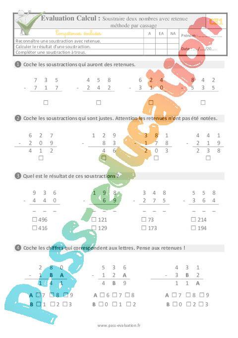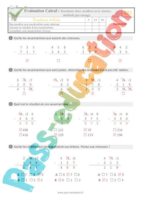 Soustraire deux nombres avec retenue méthode par cassage au CE1 QCM pdf