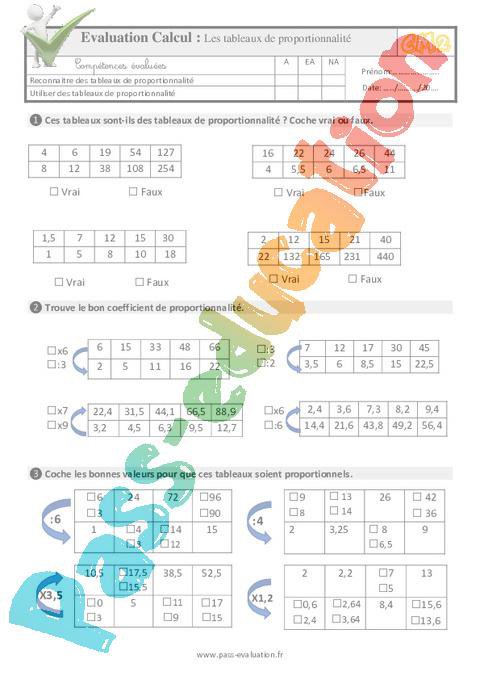 Tableaux de proportionnalité au CM2 – Evaluation QCM – Quiz à imprimer pdf