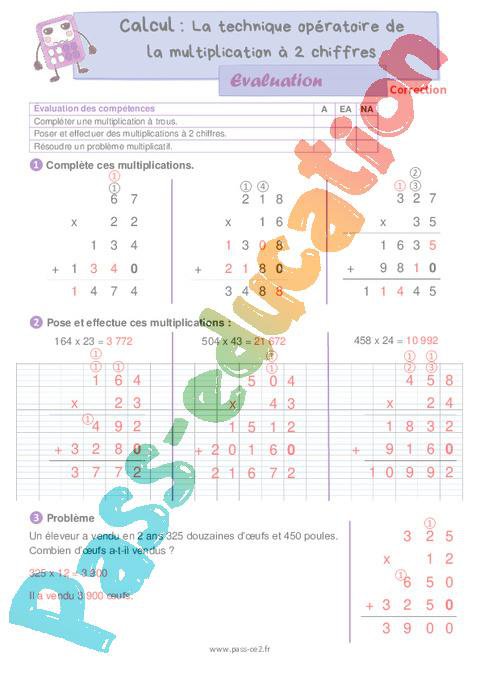 Évaluation de calcul pour le ce2 sur la technique la technique opératoire de la multiplication à 2 chiffres.