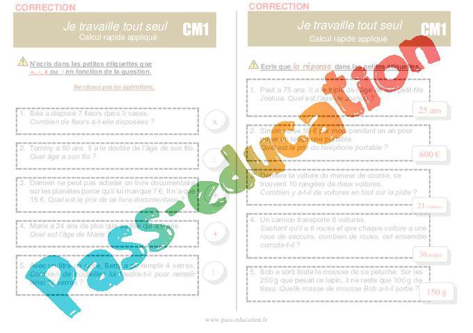 Calcul rapide appliqué -CM1-Travail en autonomie- Correction pdf