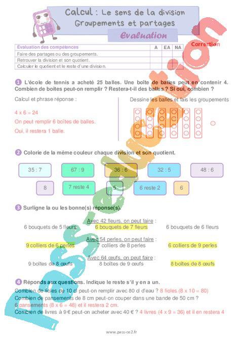 Évaluation de calcul pour le ce2 sur le travail sur le sens de la division.