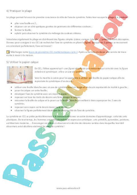 Aborder la symétrie en CE1 Ce que disent les programmesLa symétrie fait partie du programme de géométrie CE1. Durant le cycle 2, l’élève apprend à : « reconnaître si une figure présente un axe de symétrie (à trouver), visuellement et/ou en utilisant du papier calque, des découpages, des pliages. » Cela implique de lui apprendre à reconnaître la symétrie axiale dans son environnement et à « compléter une figure pour qu’elle soit symétrique par rapport à un axe donné. »