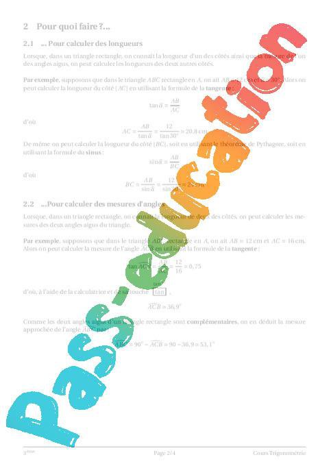 Sujet : Trigonométrie dans le triangle rectangle – 3ème – Géométrie – Cours – Exercices – Collège – Mathématiques