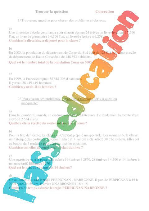 Trouver la question – Problèmes – Cm2 – Exercices -2 – – Cycle 3 – PDF à imprimer