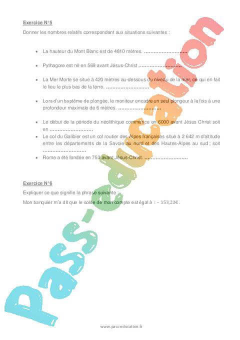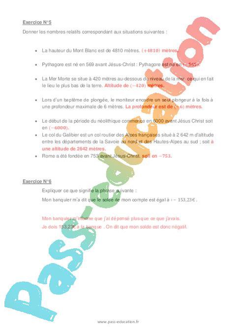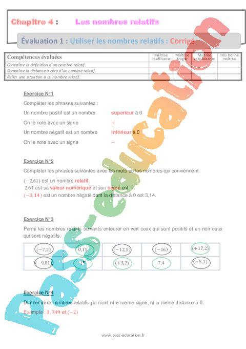 Evaluation, bilan, contrôle avec la correction sur comment utiliser les nombres relatifs pour la 5ème